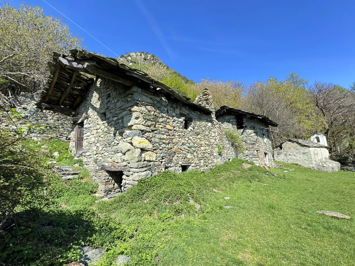 [0h05'T1] 0,28km Attraversare il ponte e imboccare il sentiero che attacca il versante destro orografico della valle, inizialmente ampio e selciato come una mulattiera. Procedere fino al punto in cui il tracciato si restringe alla larghezza di un sentiero di montagna. Continuare a salire lungo il versante, guadagnando rapidamente quota nel vallone del torrente Grand-Rodoz. Il sentiero rimane ben tracciato mentre il bosco si infittisce. Proseguire fino a raggiungere la zona in cui si trova una grossa barma parzialmente chiusa da un muro in pietra a secco. Superare la barma e proseguire in direzione del centro del vallone, dove l'aria si fa più umida. Dopo un breve tratto tra la vegetazione, raggiungere il ponte in legno che attraversa il torrente Grand-Rodoz. Attraversare il ponte e salire sul versante opposto, dove l'aria si fa subito più asciutta. Sul lato sinistro del sentiero, riconoscibile per il basso muro semicircolare dall'interno calcinato, si trova ciò che resta di una fornace da calce. Continuare a salire fino al punto in cui il sentiero domina dall'alto la chiesa e il castello abbandonato di Saint-Germain. Proseguire lungo il sentiero che percorre una larga cresta, superare ai piedi una minuscola edicola e continuare fino a portarsi sotto il villaggio di Rodoz. Raggiungere il bivio da cui si dirama il sentiero per la cappella.