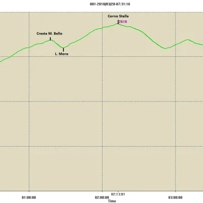 Partenza da Foppolo alle 7.31 con già +2°C saliamo lungo le piste sino al Rif. Montebello, sin lì tutto bene come usciamo dalle piste la neve è pessima sotto la croce del Montebello troviamo 7 skialp che rinunciano alla salita al Corno stella per neve pessima noi proseguiamo lungo la lunga cresta che porta sopra il passo di Val Cervia e poi al L. Moro ci fermiamo più volte per togliere e mettere ciaspole e ramponi (Mattia a avuto la brillante idea di lasciare in macchina le ciaspole poi se ne pentirà)