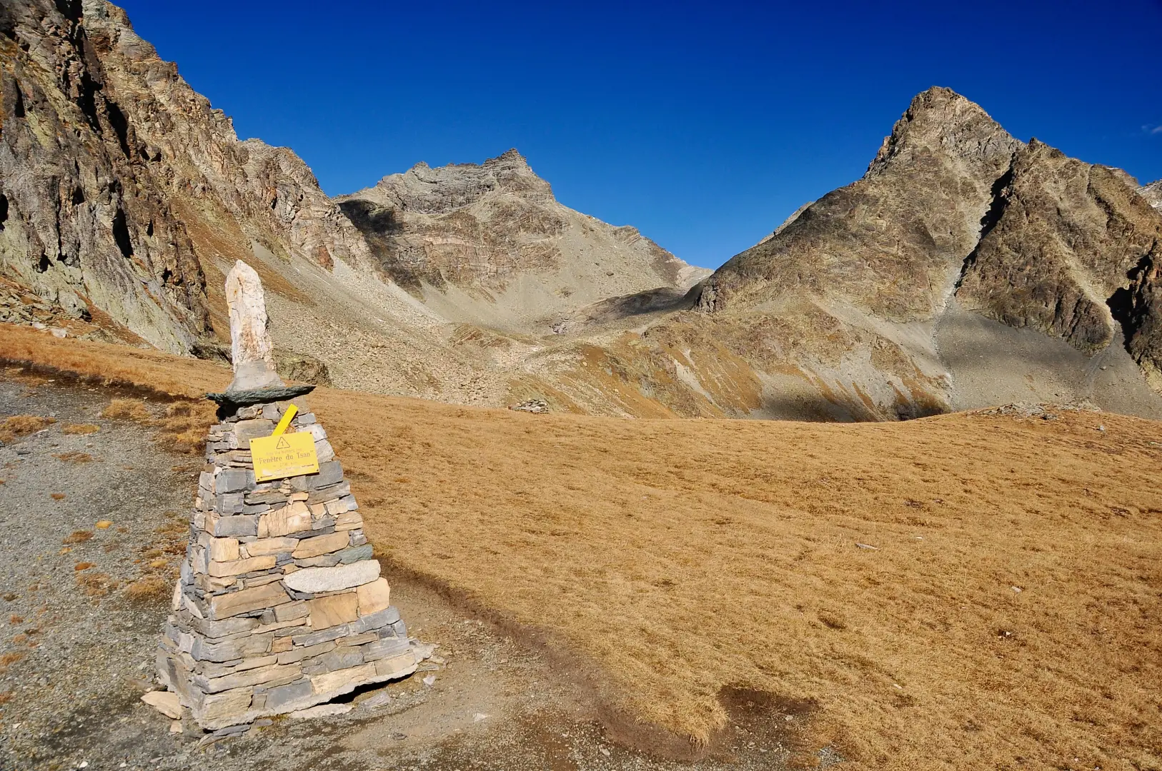 Il sentiero entra ora nella comba di Chavacour, attraversa un torrentello e guadagna un ripiano segnalato da un grande ometto (2.611 m). Con alcuni tornanti si sale una dorsale erbosa, poi si prosegue in leggera pendenza fino ad affacciarsi sull’ampia insellatura della Fenêtre du Tsan (2.730 m).