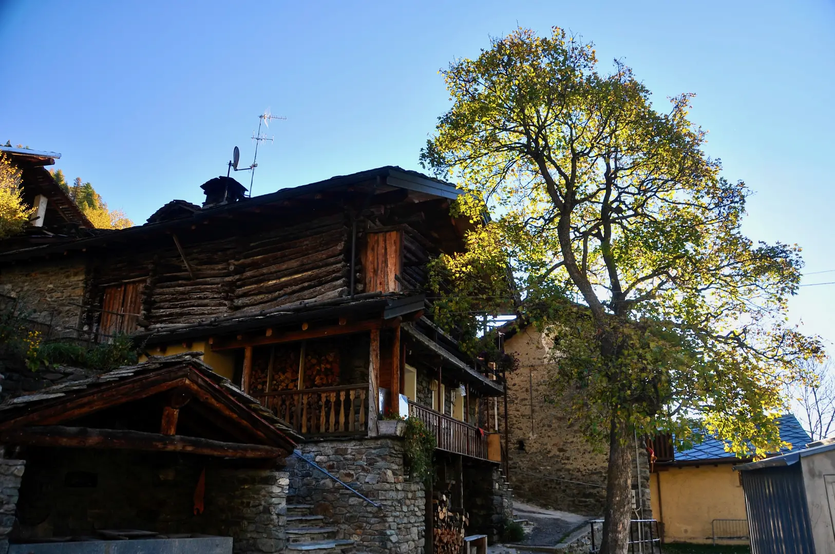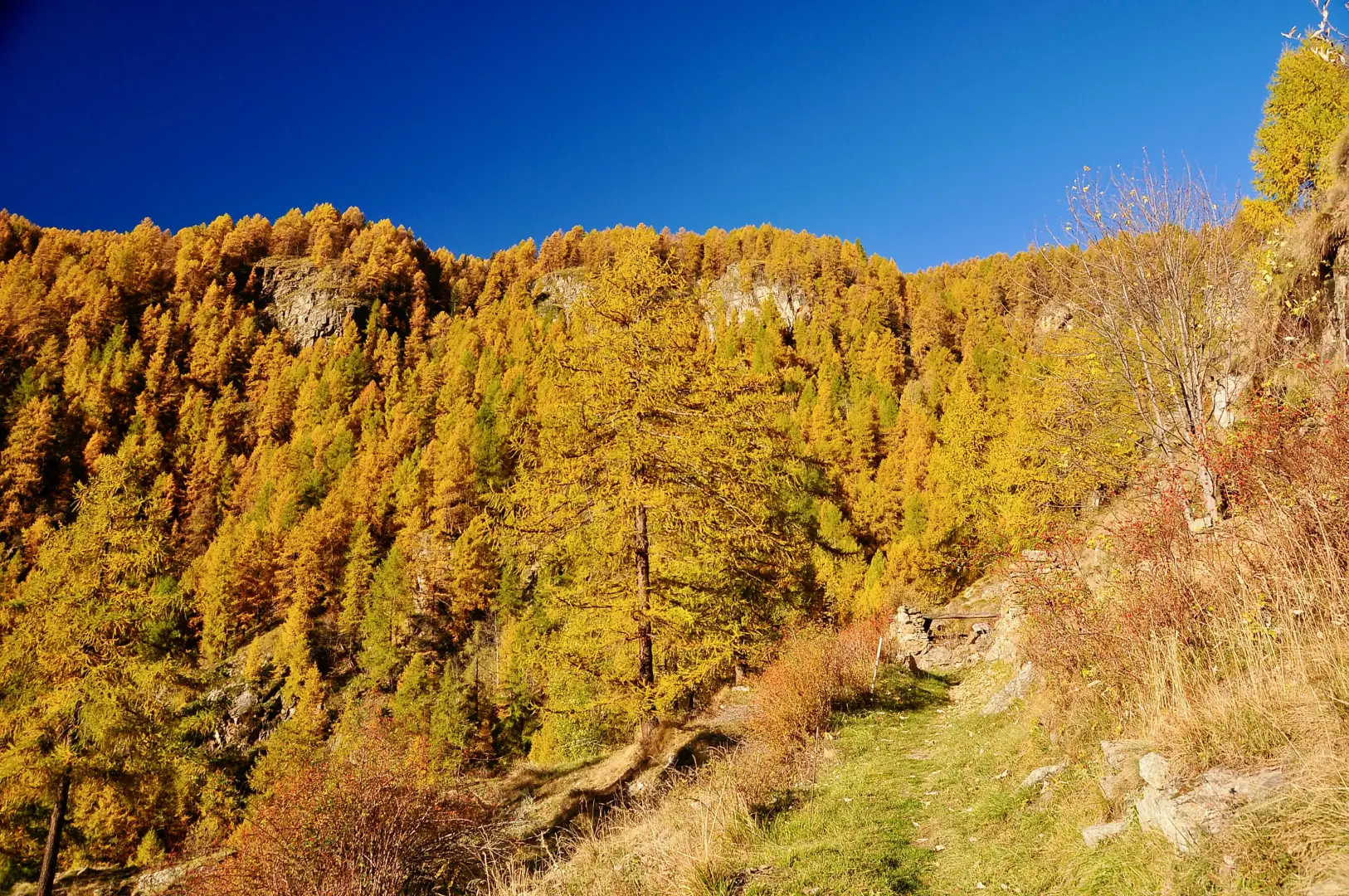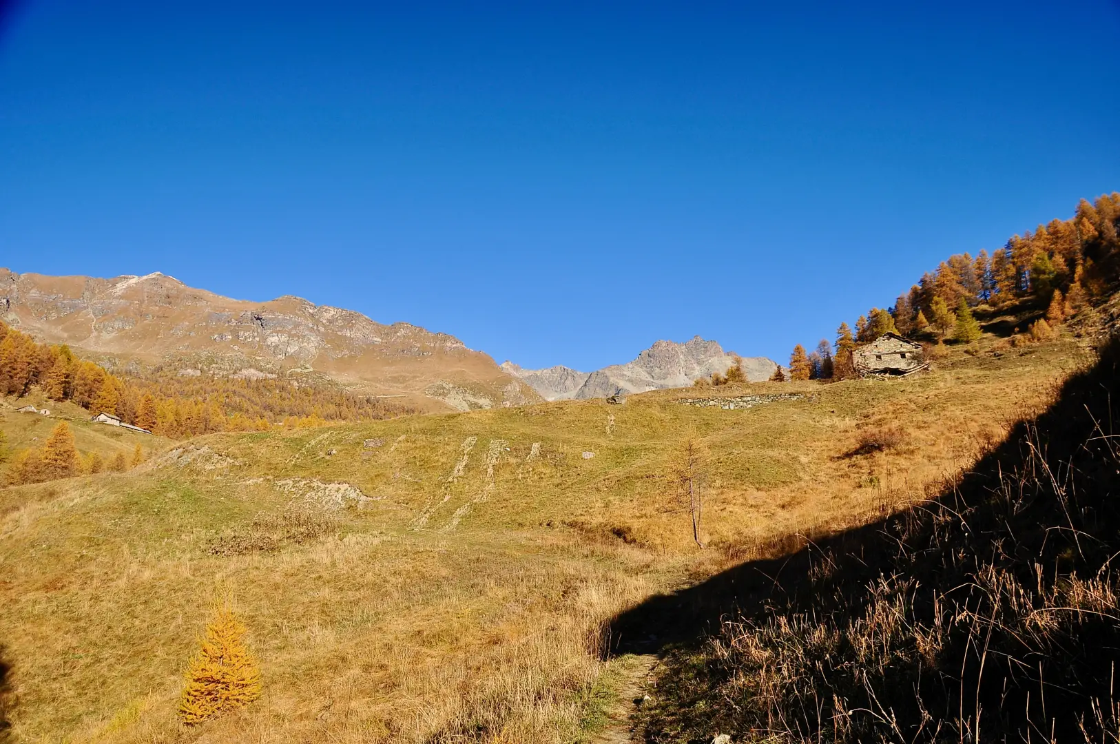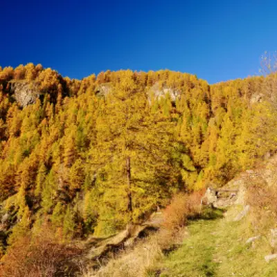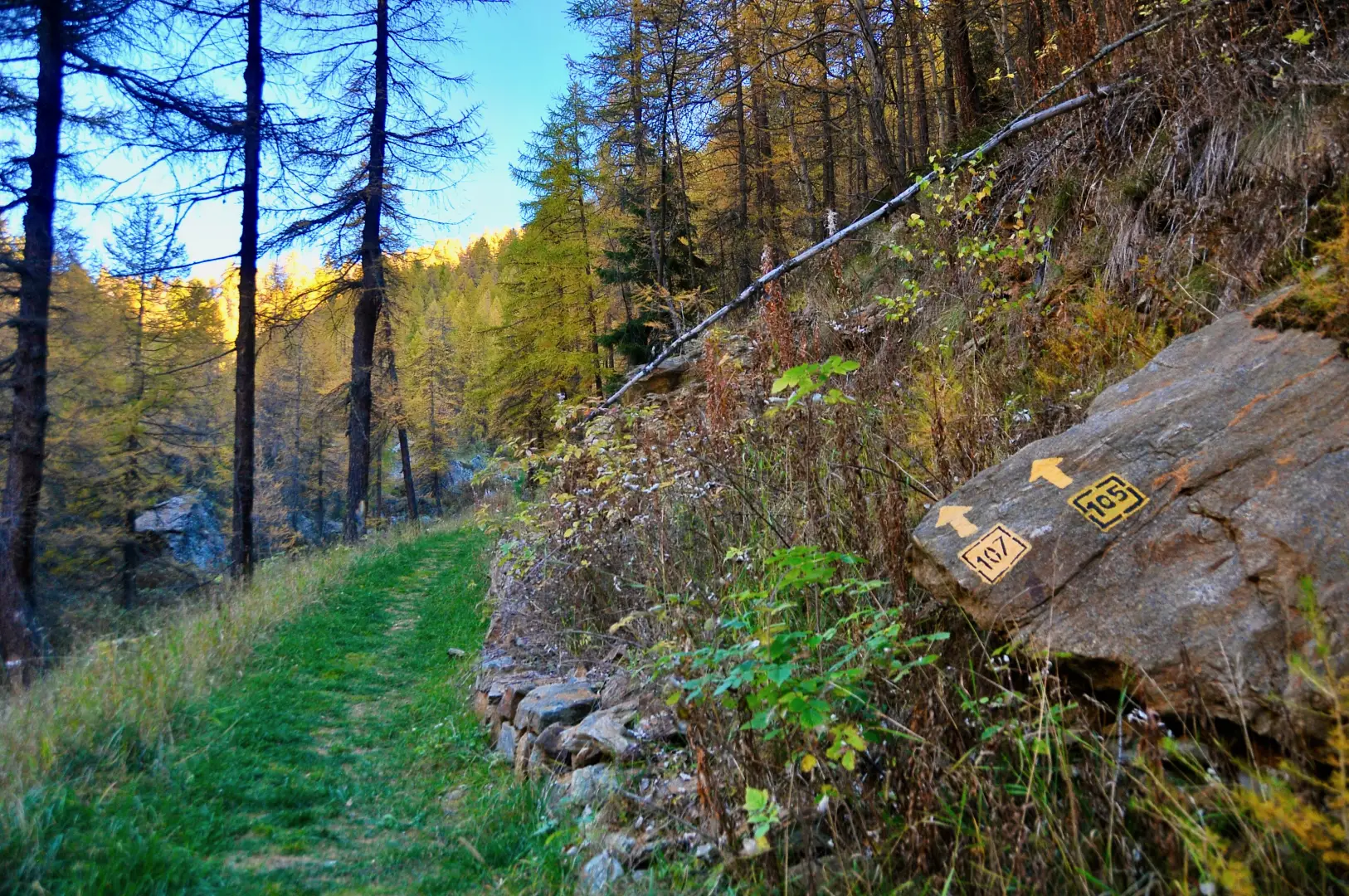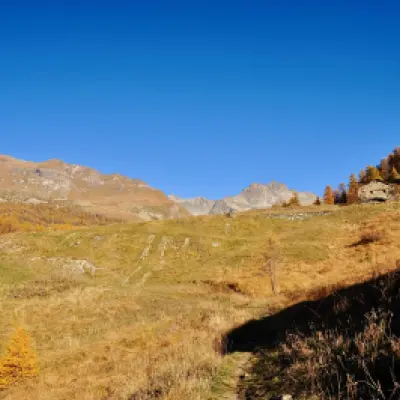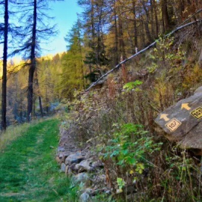 0h00' 0,00km 0h00' Dal parcheggio, nei pressi del quale è presente un fontanile (💧), procedere diritti in direzione sud-est verso Etirol (1.598m) e un bellissimo acero (Acer platanoides). Raggiunte le prime case, girare a sinistra, poi a destra e nuovamente a sinistra attraversando il villaggio. Superata l’ultima abitazione, attraversare la strada poderale e proseguire sull'antica mulattiera lastricata che entra nel bosco in direzione nord-ovest. Dopo qualche minuto di cammino si incontra un vecchio rascard collassato. Continuare in leggera salita nel bosco, che in autunno si colora di splendide tonalità gialle. Il sentiero incrocia poi un piccolo ruscelletto e diventa leggermente più ripido, fino a ritrovare la strada poderale. Seguirla fino al rudere del vecchio alpeggio di Levaz Dessous (1.677m), dove la strada termina e si riprende il sentiero. Proseguire quasi in piano lungo il sentiero, che piega leggermente a destra entrando nel vallone di Petit Monde. A quota 1.690m si incontra l’innesto del sentiero .