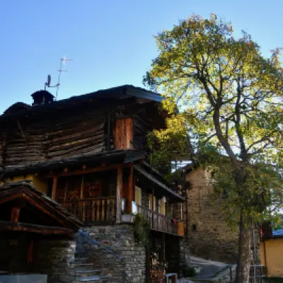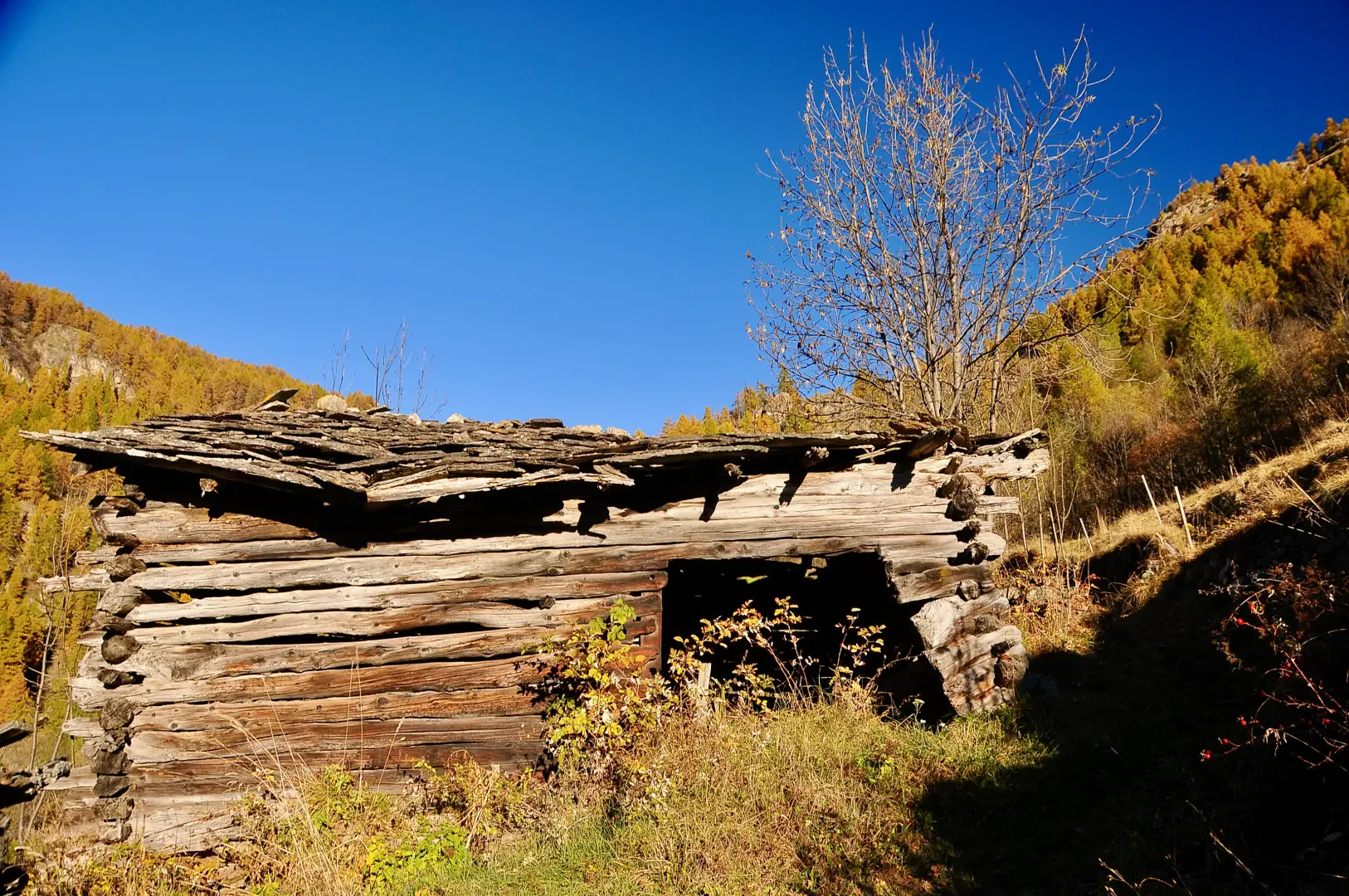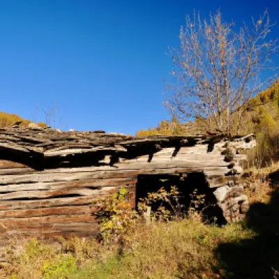 1h30' 3,65km Svoltare a destra e imboccare un sentierino che si snoda lungo il pendio erboso all'interno di un rado bosco. Con alcune brevi svolte, il sentiero guadagna rapidamente quota, portandosi su un promontorio panoramico da cui si può osservare chiaramente la morfologia del sottostante pianoro di Loditor. Proseguire in direzione nord, entrando in una piccola conca aperta dove si trovano i resti di un antico forno da calce. Da qui, rientrare nel bosco e superare il valico, da cui si avvistano i ruderi dell’antico Ospizio di Chavacour (2.058m). Dopo una breve salita, si raggiunge l’alpeggio di Château (2.087m). Si riprende per un breve tratto la strada poderale, per poi deviare nuovamente a sinistra, fino a raggiungere i ruderi del Crot du Loup (2.158m).