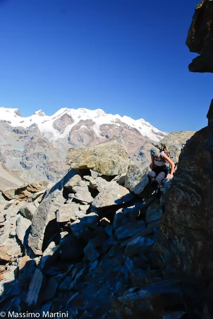 Poco prima del colle staccarsi dal sentiero per il Grand Tournalin e passare leggermente al di sotto della depressione rocciosa; superare in aderenza una breve balza rocciosa per portarsi con qualche passaggio di I°grado sulla linea della cresta nord. Superate le prime asperità proseguire su rocce rotte con qualche passo lungo e qualche appoggio di mano. Ogni tanto si passa sul versante orientale e non si può non rimanere piacevolmente sopraffatti dagli incantevoli scorci panoramici sul massiccio del Monte Rosa. I passaggi alpinistici sono presenti in modo discontinuo, alcuni sono di pura progressione in aderenza, altri necessitano di qualche appoggio ricercato. La progressione conduce l'alpinista su di un tratto lungo il versante orientale, con qualche breve saliscendi, prima di inserirsi in un intaglio nella cresta e portarsi quindi sul versante occidentale dove si superano altre rocce rotte prima di affrontare alcuni passi leggermente esposti. Superati questi ultimi ostacoli si procede ancora per un breve tratto su placche inclinate prima di raggiungere la sommità detritica sormontata da un grosso ometto in pietra (3207m).