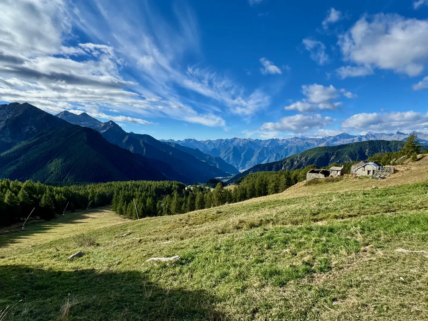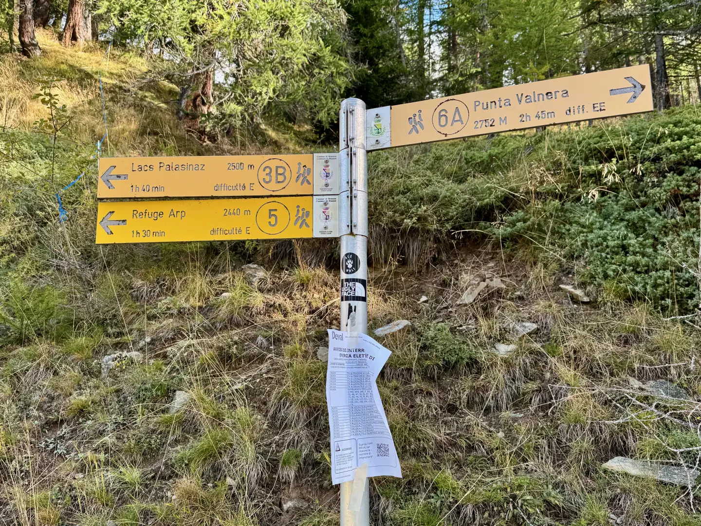 1h20' 3,73km Trascurare il sentiero sulla destra e proseguire dritto fino a incontrare un grande masso. Imboccare un sentierino che taglia alcuni tornanti della strada. Seguire le frecce gialle e risalire il pascolo in diagonale fino a raggiungere l'alpeggio di Chavanne (2347 m). Riprendere la strada sterrata e seguirla lungo alcuni tornanti fino a raggiungere l'alpeggio di Palasinaz (2402m) e una palina segnaletica.