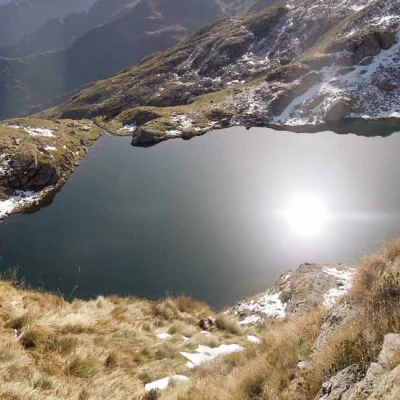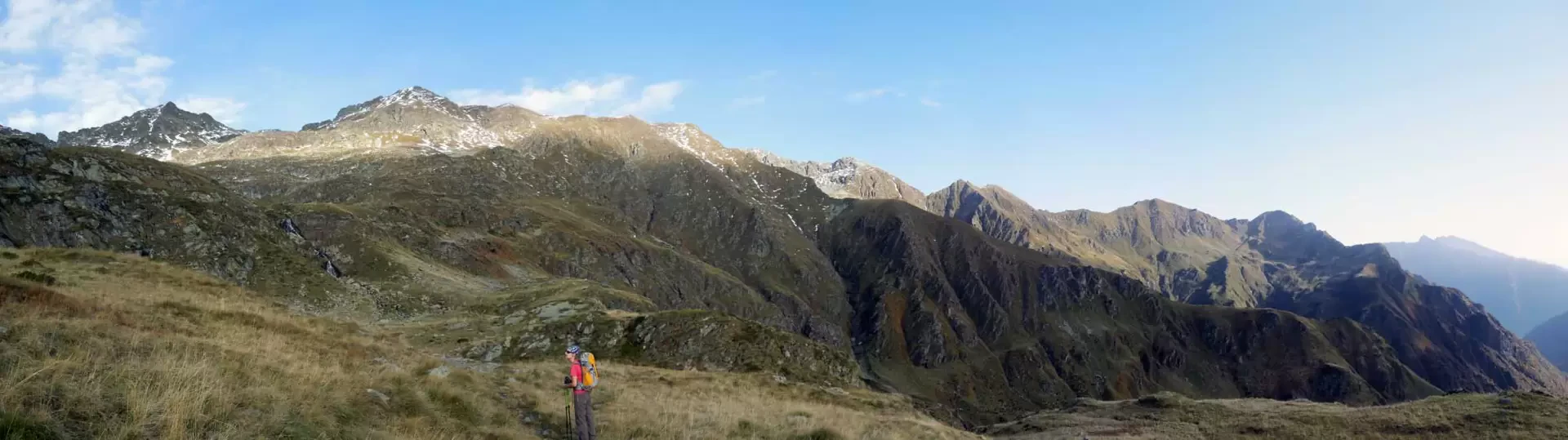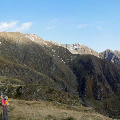 Dal parcheggio si entra nell'abitato e ci dirige verso la chiesa salendo la scalinata di fianco ad essa da cui, sulla sinistra, parte il sentiero. Si cammina su una bella mulattiera erbosa che attraversa le pendici erbose del Monte Prevor arrivando subito ad un bivio con un sentiero che si stacca sulla destra che si ignora per continuare, sempre in lieve pendenza, sino alla baita Sass da Mür. Superata la baita ci si alza leggermente arrivando ad un bivio situato in prossimità di un ponticello (1384 m) che non si attraversa per proseguire sulla destra; salendo di fianco al torrente si arriva ad un altro ponticello che si attraversa sulla sinistra rimontando una bassa costola erbosa che, passati di fianco ad una bella cascata, ci porta in una conca superiore. Questa si attraversa piegando leggermente sulla sinistra indirizzandosi verso il pendio che si trova alla destra di una cascatella che si inizia a risalire; traversandolo sulla sinistra si salgono alcuni stretti tornanti che fanno guadagnare subito quota arrivando ad un promontorio erboso dal quale il sentiero spiana decisamente in vista dell'Alpe Piana di Via che, rimanendo alla sinistra ad un bivio che la precede di pochi metri, si raggiunge in breve (1727 m). Raggiunta la baita superiore si trovano le paline che ci indicano di proseguire sulla destra compiendo un lungo traverso sotto una bastionata rocciosa dove si supera una cabina in muratura dopo la quale, attraversato un ruscello, si giunge ad un altro bivio (1823 m). Qui si devia decisamente sulla destra superando una spalletta dopo la quale si arriva all'Alpe Capezzone e si continua in leggera pendenza attraversando un torrentello; in seguito, arrivati nei pressi di una bassa bastionata rocciosa, la pendenza aumenta un po' per risalire il pendio alla sinistra al cui termine si giunge ad un pianetto erboso. Qui (1956 m) si tiene la sinistra verso un ometto di pietre, ignorando la freccia di vernice che indica di proseguire diritto, e si attraversa un ruscello dirigendosi al pendio di bassa vegetazione alla base di alcune balze rocciose. Saliti alcuni tornanti il sentiero inizia un traverso a destra dove si supera una larga roccia liscia con l'aiuto di alcuni gradini scavati su di essa dopo la quale, continuando ancora sul traverso per alcuni minuti, si giunge al panoramico rifugio situato nei pressi dell'estuario del Lago Capezzone.