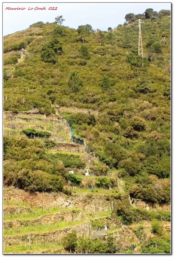 Scesi dal treno, si visita Riomaggiore. Arrivati sulla strada di accesso alle auto, si piega a sinistra per via De Gasperi raggiungendo il punto di inizio. La via Beccara (antico collegamento) si inerpica in modo molto ripido (da fare con tutta calma) con scalini irregolari e altissimi…! Si guadagna velocemente quota. Scartata una deviazione per la rotabile, si continua in modo meno faticoso fino a trovare un bel punto panoramico dove spiana a 240 m. Da Costa del Corniolo i gradini cadono a Manarola, con una pendenza superiore alla salita appena superata. In realtà, si fa una scelta diversa, andando dritti e sorpassando un cancelletto. Stranamente, la direzione è assente nella cartellonistica verticale in loco! Quasi subito riappaiono i simboli, tenendo la sinistra a un bivio. Si taglia in falsopiano, tenendo a mente che l’indicazione giusta è quella per Groppo (240 m). Raggiunto l’abitato lo si attraversa fino a un cartello su un muro che invita a piegare a destra. Con un tracciato un po’ più selvaggio, ci si inerpica fino alle case di Volastra. Dal Santuario Nostra Signora della Salute (XII sec.) a Volastra (335 m) è possibile una pausa. Il sentiero ora è quasi pianeggiante e costeggia diversi vigneti. Si osserva la piccola frazione di Porciana (360 m) e dopo si entra in un bosco. Il percorso poi si abbassa verso l’abitato che infine è raggiunto. Finita la visita, con una scalinata a zig zag si cala dalla stazione e il treno porta a La Spezia