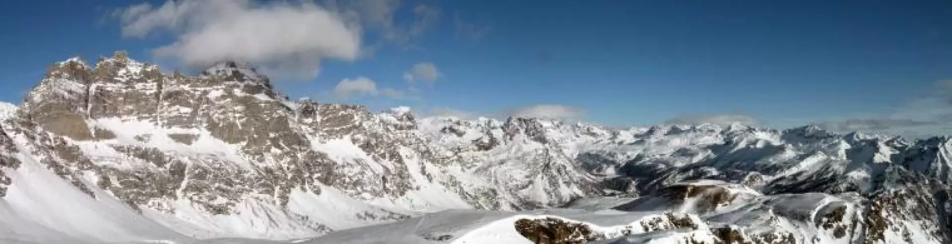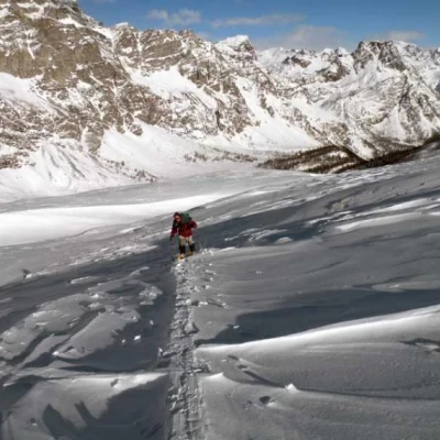 Dal parcheggio ci si avvia verso la stradina asfaltata che salendo si addentra nelle prime case della piana del Devero e subito al primo bivio, in corrispondenza delle paline indicative per l’alpe Misanco, si devia a sinistra verso un ponte che si attraversa. Camminando ai margini del pianoro si raggiunge il piccolo villaggio di Pedimonte. All’inizio di quest’ultimo si trovano ancora le indicazioni per l’alpe Misanco che ci indirizzano a sinistra ad attraversare un altro ponte. Si inizia a salire con pendenza moderata nel bosco seguendo a breve distanza il corso del Rio Buscagna, si compiono alcuni tornanti e, deviando leggermente a sinistra, ci si allontana sempre più dal corso d’acqua raggiungendo un altro ponticello. Superatolo, la pendenza si accentua un poco salendo abbastanza direttamente verso la parte alta del bosco che si fa più rado e ci si dirige verso una bastionata alle cui pendici di trova il piccolo pianoro dove si trova l’alpe Misanco (1907m). Si supera l’alpeggio e si sale per poco l’ampio pendio sulla destra del bosco sino ad una quota di circa 1960m da dove si devia decisamente verso destra per risalire il basso crinale con pochi alberi e poi continuare, costeggiando la fiancata della montagna, con alcuni saliscendi. Si giunge così a due piccole baite (2036 m) che si lasciano sulla sinistra e si sale verso una strozzatura dalla quale si continua in una specie di corridoio tra i dossi. In breve si arriva negli spazi aperti della parte superiore della valle Buscagna sovente battuti dal vento e si prosegue verso sud-est, senza percorso obbligato, ora risalendo brevemente ed ora passando nei punti di minor pendenza dei larghi dossi nevosi tenendosi prevalentemente verso la sinistra della larga vallata. Dopo qualche saliscendi si passa poco al di sotto della quota 2402m e finalmente si vede la vetta meta dell’escursione; si supera ancora una piccola depressione e poi si inizia a risalire l’ultimo tratto, un po’ più ripido, che conduce alla piccola ma panoramica vetta.